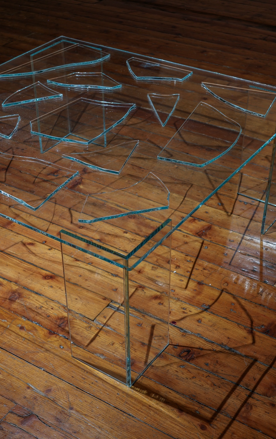 Luigi Pensa, Broken table, 2024. Vetro lavorato e smussato, 40x100x100 cm