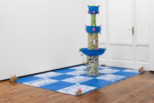 Luigi Pensa, Fontana del giocoliere, 2023. Metallo verniciato e cubicato, plastica, sassi, meccanismo, acqua, Fontana: 175x70x70 cm / Telo: 295x200 cm