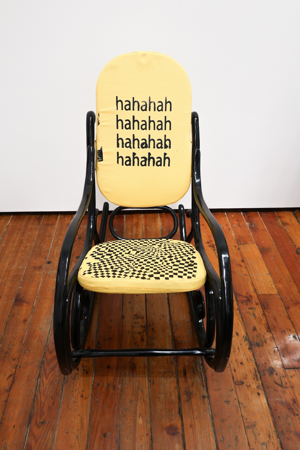 Luigi Pensa, Guarda come dondolo, 2024. Legno, tessuto serigrafato, 98x48x85 cm