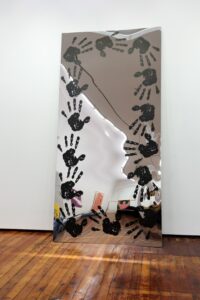 Luigi Pensa, La bellezza sono io da piccolo, 2024. Serigrafia su specchio di acciaio inox, 300x150 cm
