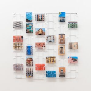 Luigi Pensa, Milano Glass Postcards, 2025. Struttura in ferro, stampa digitale su vetro, 100x100 cm