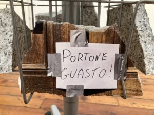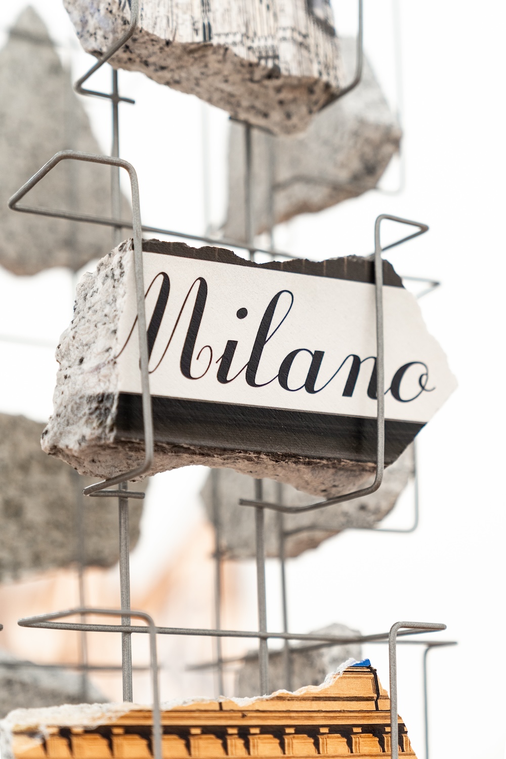 Luigi Pensa, Milano Rock Postcards, 2025. Struttura in ferro e plastica, stampa digitale su granito, 195x55 cm