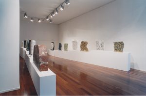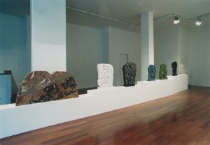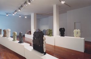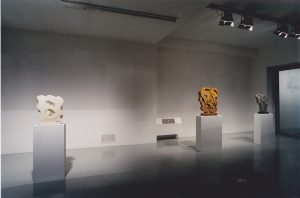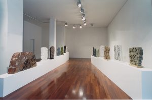 Pietro Consagra exhibits twenty works for the solo exhibition at Galleria Fumagalli, identifying a path in the variety of stones and types of his sculpture: marble, granite, onyx and alabaster from white to blue, from yellow to green, from blue to black. The exhibition shows the new concept of “thickness” according to which the artist has transformed his work from two-dimensional and frontal to bifrontal, almost like “a wall that divides two fields”, writes Consagra. «The natural sly color of sculpture becomes unbridled, intractable, provocative», continues the artist. In the exhibition the color is fascinating in Trapani marble, in the essential profile of the Pietra Matta di San Vito – Rosso Sant’Agata from 1972.