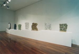 “Matta” – which means crazy – in the double meaning of unpolished, “possessed”, in the animation of the fantastic invention, like in a dance of San Vito. The color becomes precious in the threading of the inlays of the Bifrontale Bianco Carrara Diaspro Verde e Rosso, from 1975. It is highlighted by the virtuosity of the staggered levels of the two Bifrontali Verde Cinese (the name and the color of the marble, as always, appear in the title) from 1977 and 1991 and by the sumptuousness of the granite of the Prominenza Blu del Brasile from 1992. Or it turns out impeccable, as in the sharp and absolute contrast of the Addossato Nero del Belgio e Bianco Macedonia from 1982.