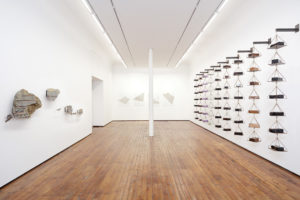 The essentiality – manifested primarily by the elements that constitute the works – is conveyed by the exhibition layout itself: three installations on three walls of the gallery’s main room. While not intending to impose any forced connections between the artists, all the works show a strong presence of the material, yet balanced by the sense of lightness given by the fragmentary characteristic of their elements.