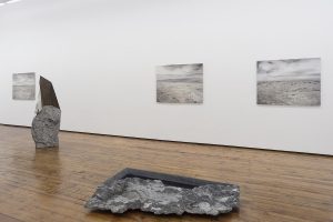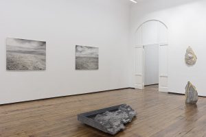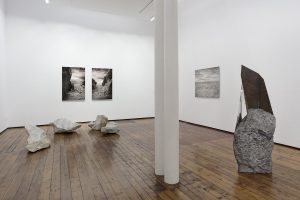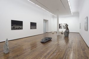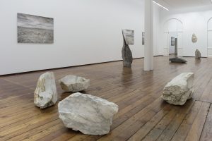 Mattia Bosco searches for the origin, where everything started before time was History, exploring the boundaries of the tangible and the spaces that exceed the limits of reality, finding in the stone the sign of this principle. The rock surface, expression of a millenary geology, is carefully selected in the mountains of the Val d’Ossola and transformed into a sculpture by the artist’s gesture, which does not invent a new form, but follows its natural process bringing out its profiles. Mattia Bosco intervenes on mineral aggregates transforming the material not only in its conformation but also with the addition of external bodies such as steel inserts and applied gold leaf. Examples of the first type of work are Lago nero (2014), a sculpture in black Marquinia marble whose shape alludes to the sedimentation that time marks on the stone as if the rock were time in a solid state, and a group of Carrara marble sculptures with sloping lines carved by a three-axis robot (Henraux). To the second type of works, insertion of new materials in the stone, belong the sculptures Sezione aurea (2017), in black rosewood marble and gold leaf, and a group of stones (2018) in black rosewood marble with inserted steel and iron spikes.