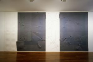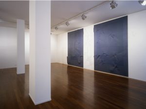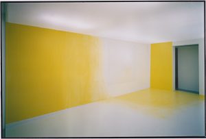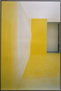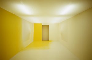«Se il segno si disponeva per parallelismi e simmetrie cui contraddicevano controllati trascendimenti, ora – spiega Bonalumi – è segno sciolto, liberato, allusivo del gesto e ancora allusivo di una mira alla costruzione. La monocromia sollecita la percezione alla notazione di labili variazioni tonali, annuncio di geometrie perturbate per il segno, il correre sotto traccia di un tondino di acciaio, che trattiene verso un intuibile interno all’opera o respinge la superficie». L’altro lavoro esposto è Opera Ambiente Giallo-Bianco appositamente progettato e realizzato per questa mostra. Si tratta di una nuova prova dell’interesse di Bonalumi per l’opera d’arte come dato e apparenza, razionalità ed espressione.