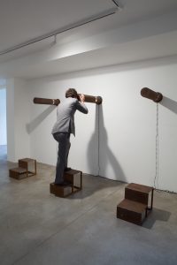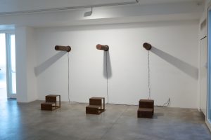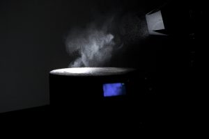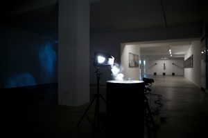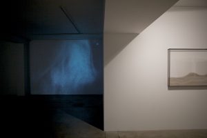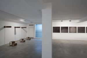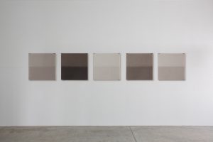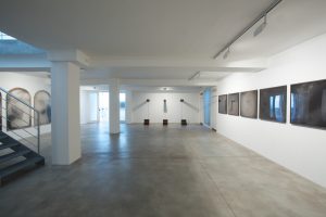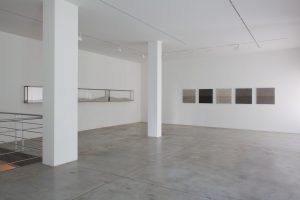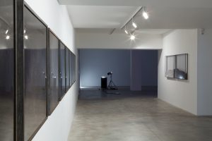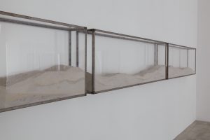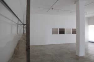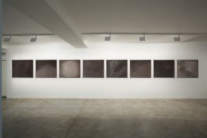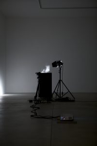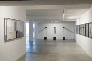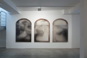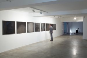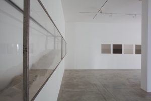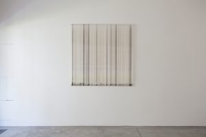 Le opere Orizzonti sono paesaggi immateriali, superfici in cui non è afferrabile una fine, tutto è irraggiungibile e inafferrabile, tutto vuole essere l’analisi di una analisi della realtà fatta di corpi e corpuscoli invisibili. Il lavoro contiene un senso di incerto temporale, un percorso, un passaggio da una condizione all’altra o un passare da un luogo all’altro, un attraversamento. Il materiale e l’immateriale, il passato e il presente, il dubbio, l’individuo e il cosmo, l’imponderabile e il non tangibile. In mostra l’istallazione Causa effetto, posta in una stanza buia. Attraverso il suono di un respiro registrato la polvere finissima di cenere viene leggermente mossa e sollevata. Aumentando la sua fisicità la polvere crea una sorta di ingrandimento di un microcosmo fatto di pulviscoli visibile nell’aria con una luce dedicata. Una telecamera riprende l’immagine ingrandita e la riproietta a circuito chiuso. Alla fine del processo parte della polvere ricade, mentre una parte si libera nell’aria. Nel momento di attività la cenere acquista corpo mettendo però sempre in evidenza il suo essere non tangibile e la sua esistenza immateriale ed effimera. In mostra anche l’opera Pale in cui l’artista riutilizza antichi telai destinati alle tele delle pale d’altare.